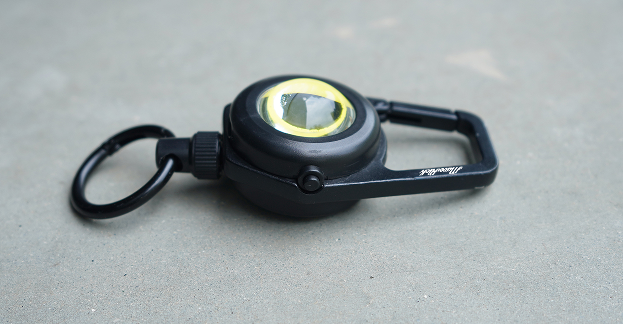 本体の上部には幅のあるカラビナを装備。 カラビナの幅が広いのでハーネスやストラップなどで使用してもねじれることがなく、安定して正面を向いてくれます。 さらにリールには丸いカラビナリングを付属。キーホルダーなどとも相性が良く取り外しが非常に簡単です。 上下にカラビナがあることで逆さに使用すると伸びる「リールライト」としても使えます。